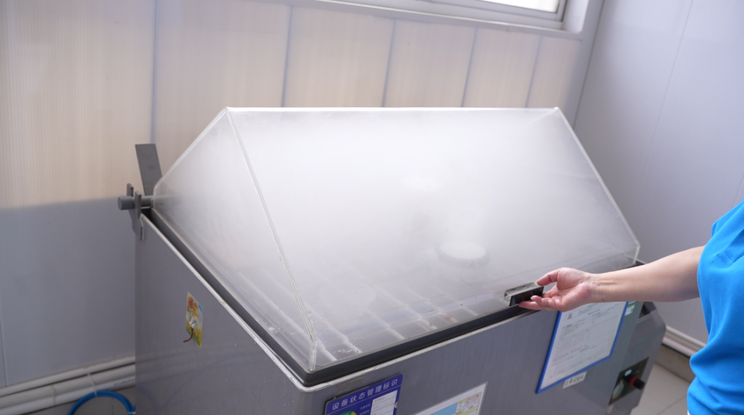 打開鹽霧測試蓋,將待測產(chǎn)品放在木板上面!放入機器當中!檢查表面是否腐蝕或者生銹!